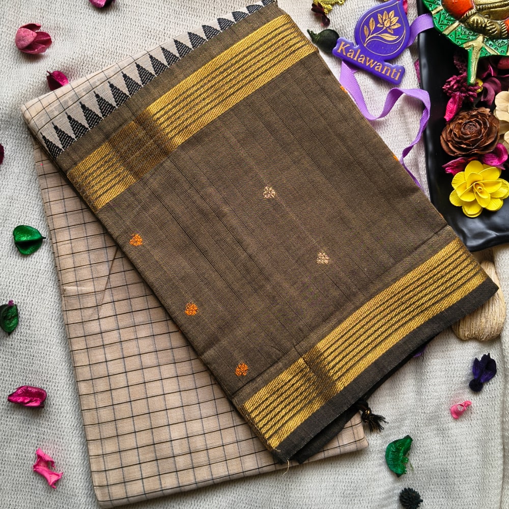 This 80 count Chettinad checked cotton saree features a soft off-white (ivory) body, giving it a clean, elegant, and timeless look ideal for everyday wear and traditional occasions. The body is woven with fine black checks, adding a subtle Chettinad character without overpowering the saree.